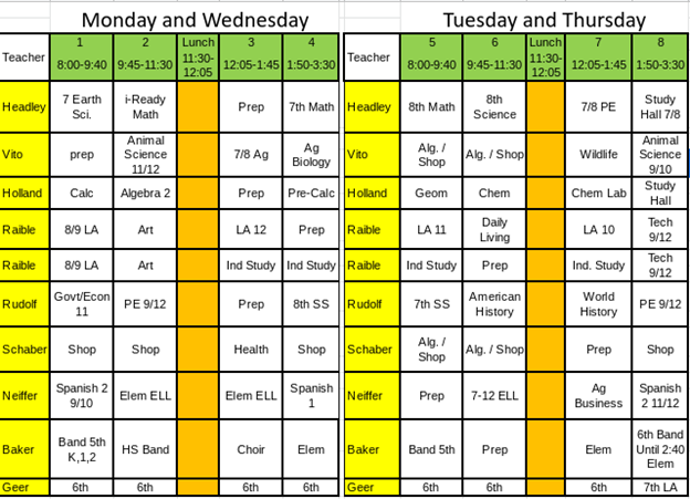 The Ione School District is thrilled to announce that last night; the School Board voted in favor of bringing all of our Secondary Students back to school full time / four days a week beginning February 8th. This date will allow staff, students and parents a chance to prepare for the block schedule (see below). While we wanted to go back to a regular schedule that was not going to be possible because of continued “classroom size restrictions” from the State of Oregon, and a few other complications. The block schedule is what we are focusing on so that kids can be in school every day. Thank you all for your patience, and we will work together to make this transition as smooth as possible. If you have any questions, please feel free to contact me at 541-422-7131.